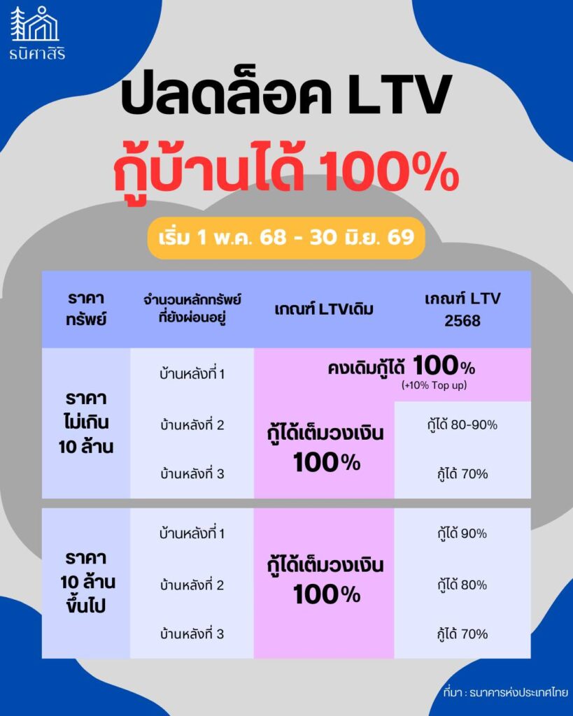 เคาะแล้ว! ธนาคารแห่งประเทศไทย ผ่อนคลาย LTV ชั่วคราว กู้ซื้อบ้านได้ 100% ในช่วงเวลา 1 ปี เริ่มตั้งแต่วันที่ 1 พฤษภาคม 2568 ถึงวันที่ 30 มิถุนายน 2569 โดยมีเกณฑ์ตามนี้
