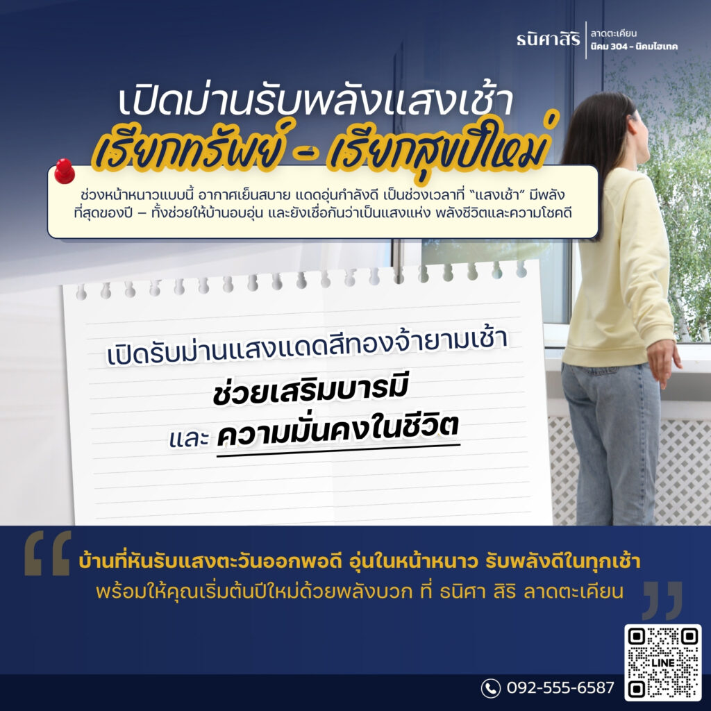 เปิดม่านรับพลังแสงเช้า เรียกทรัพย์–เรียกสุขปีใหม่ ปล่อยให้แสงแดดยามเช้าในฤดูหนาวส่องเข้ามาเติมความอบอุ่นให้บ้าน และชีวิตตามหลักฮวงจุ้ย “แสงจากทิศตะวันออก” คือพลังแห่งการเริ่มต้นใหม่ เรียกโชค เรียกทรัพย์ และเพิ่มพลังบวกให้ทั้งวัน